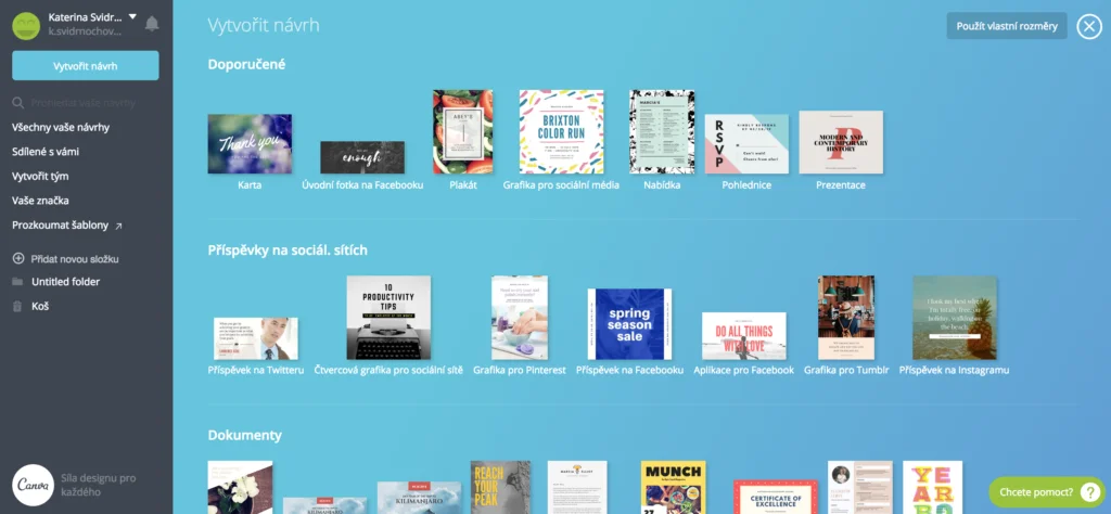 K čemu je Canva dobrá: tvorba letáků, plakátů, infografik, pozvánek, příspěvků na sociální sítě, vizitek, koláží …