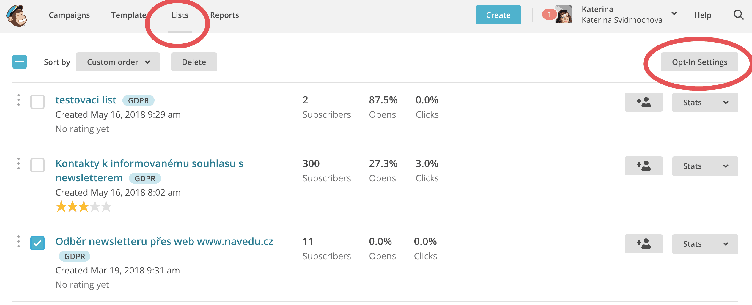 1. Vytvořte si v Lists seznam kontaktů, které potřebujete oslovit a nastavte u něj všechny funkce spojené s GDPR, viz návod úplně na začátku.