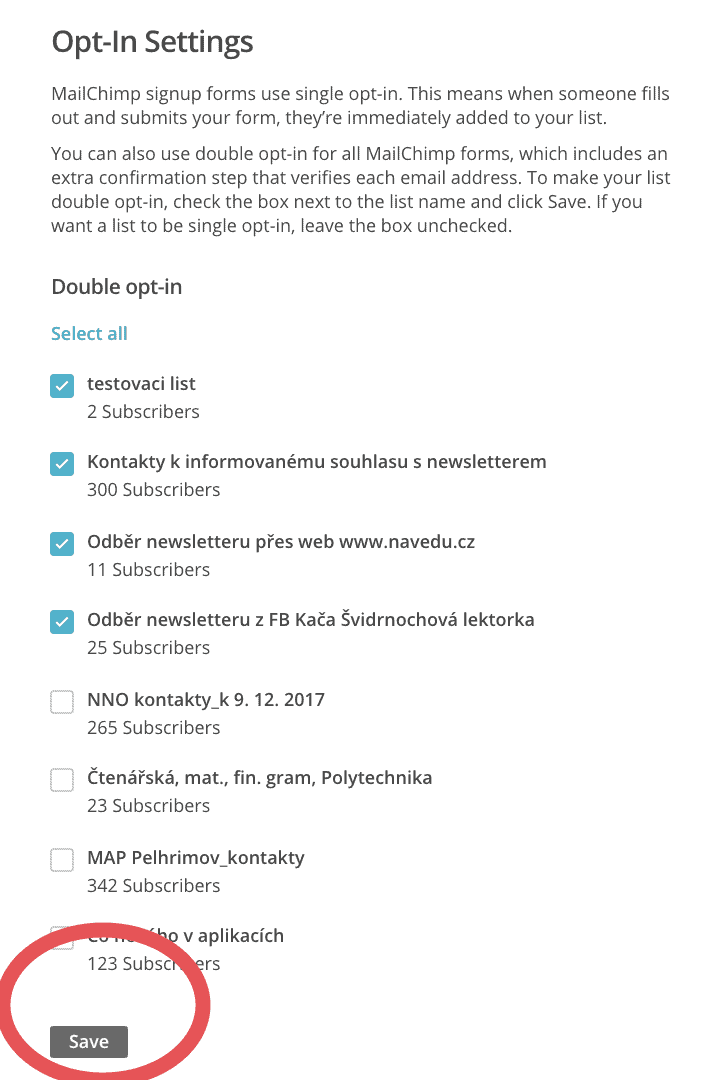 Na webu, možná i na Facebooku máte okýnko, přes které se kdokoliv může přihlásit pro odběr novinek. Je potřeba ho upravit, aby po zadání e-mailu dostal zájemce o newsletter do svého e-mailu potvrzovací čudlík/kód, po jehož odkliknutí potvrdí svůj souhlas se získáváním newsletteru. Tomuto procesu se říká double-opt in. Dodávám, že tato forma odběru newsletteru je nejideálnější. Čtenář sám aktivně projevuje zájem tak, že se aktivně přihlašuje. Pokud tedy toto okno na webu ještě nemáte, měli byste si ho vytvořit. Tady je návod přímo od Mailchimp.