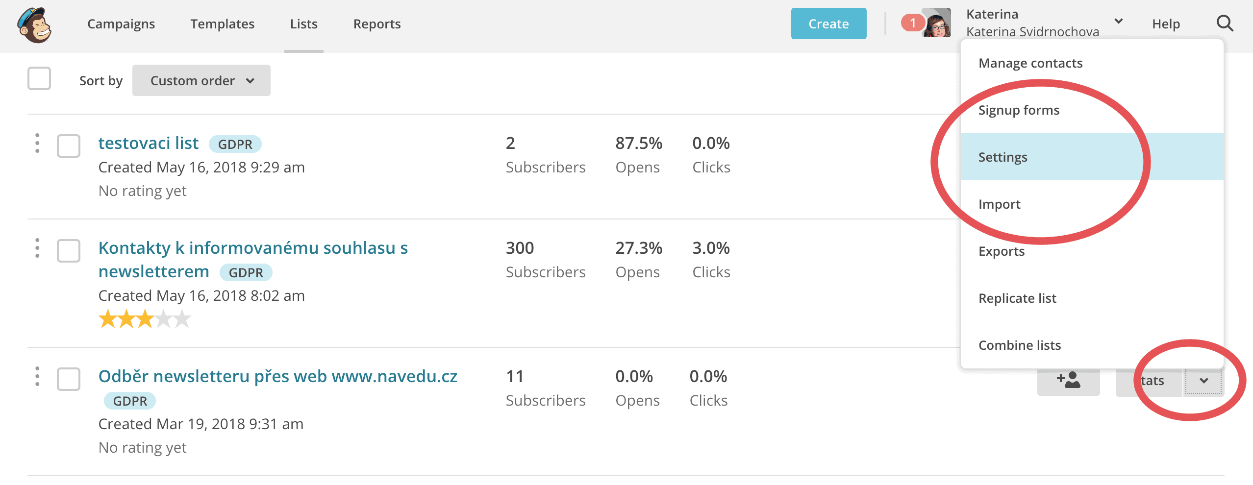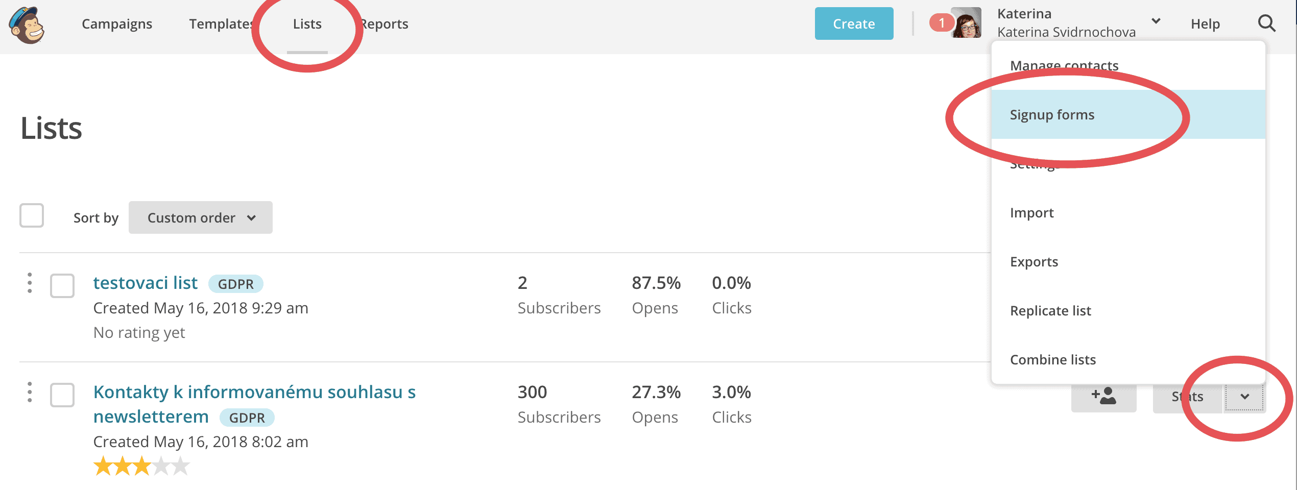 Obě opatření stojí na nastavení kontakt listu (Lists) a nastavení formulářů, které budou v souladu s GDPR (Signup Forms). Nejdříve tedy vše správně nastavte.