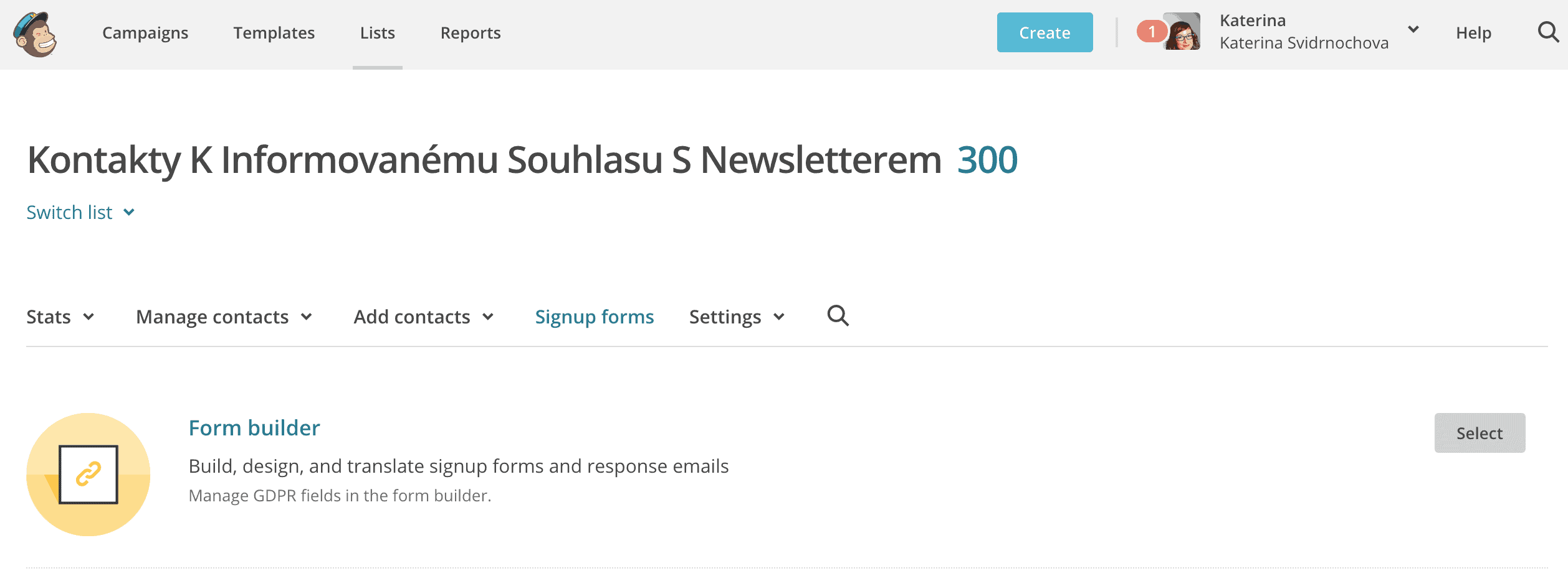 Je potřeba upravit, respektive přeložit GDPR pole v přihlašovacích formulářích. Pozor, u každého kontakt listu (Lists) to musíte udělat znovu. Postupně si tedy otevřete všechny kontakt listy (Lists), které máte vytvořené a formuláře (Signup Forms) v nich upravte. Právě zde často dochází k chybám, protože to musíme několikrát dělat ručně, snadno zapomeneme na některý překlad. Postupujte tedy pomalu a systematicky.
