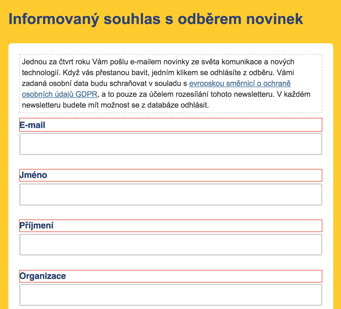 Teď už jste si nachystali všechny formuláře, které doprovází odběr newsletteru. Na řadě je jejich překlad. Ten je vlastně nejdůležitější. Texty a jejich logická návaznost vedou odběratele newsletteru k sérii kroků, které musí udělat, aby nejenže vám dal informovaný souhlas, ale také aby pochopil, jak ho dává a k čemu.