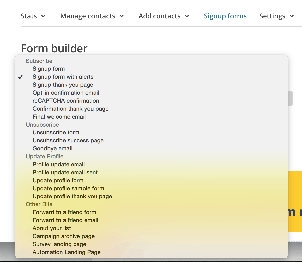 2. Klikněte vpravo na navigační menu (šipku) u kontakt listu, který chcete upravovat a vyberte Signup Forms.