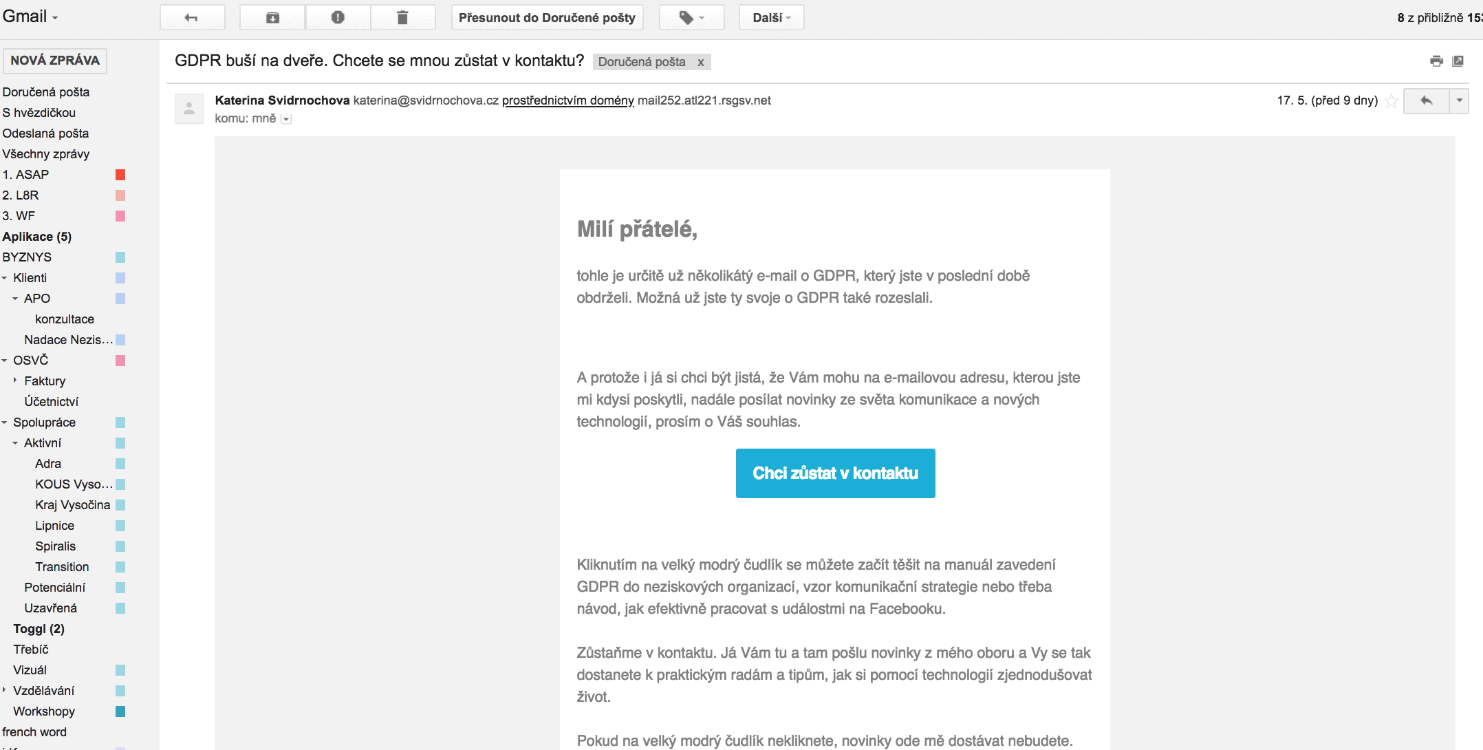 Počítejte s tím, že po této akci se vaše databáze kontaktů hodně ztenčí. Mnoho lidí e-mail s žádostí o souhlas přehlédne, rovnou smaže nebo se aktivně z databáze odhlásí. A to vůbec nevadí. Věřte mi. Vaše newslettery chcete zasílat pouze těm, kteří o ně mají aktivní zájem a kterým vaše e-maily můžou něco přinést.
