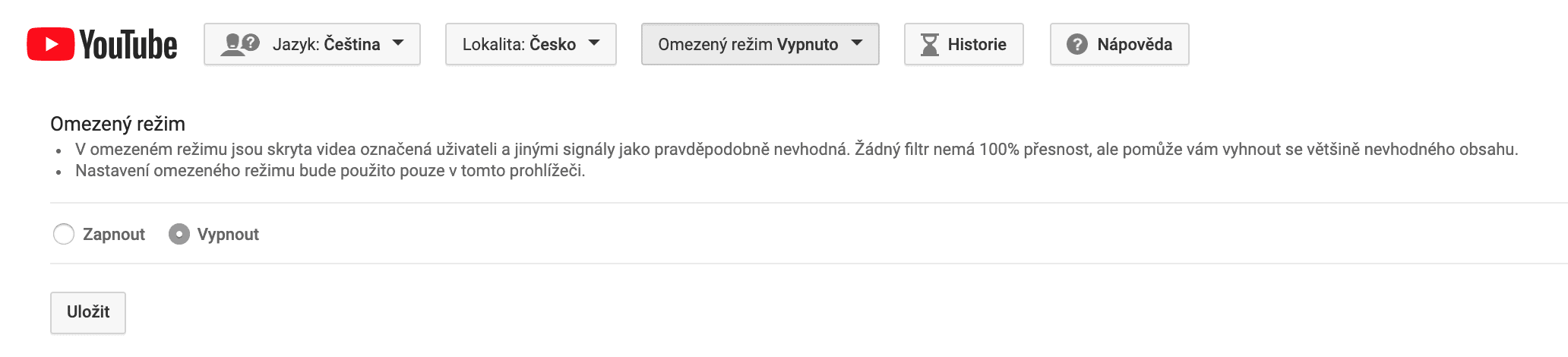 - V YouTube můžete nastavit Omezený režim. Běžte do Nastavení, skrolujte úplně dolů a v zápatí stránky máte možnost Omezený režim zapnout, viz komentář.