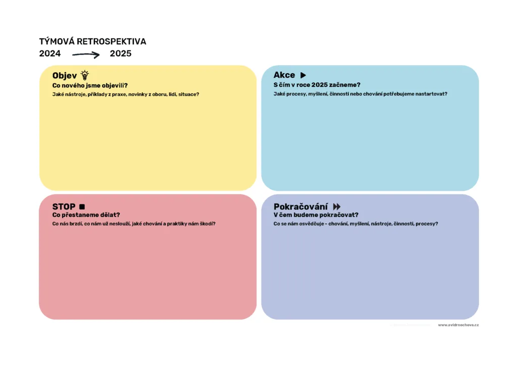Nový rok je tady a s ním i ideální příležitost trochu zpomalit a zamyslet se, co dál. Máte pocit, že v prosinci nebyl na pořádnou reflexi prostor? Nevadí – teď je ten pravý čas na týmovou retrospektivu. Stačí čtyři jednoduché kroky a šablona, kterou jsem pro vás připravila, vám pomůže začít.